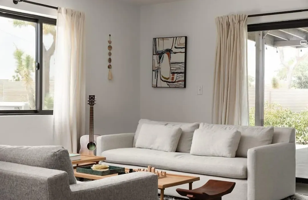 Eine komplette Küche ist gut ausgestattet, unter anderem mit einer Kaffee-/Teemaschine, einem Kühlschrank und Küchenutensilien. Die Villa ist auch vom 70 km entfernten Flughafen Palm Springs aus leicht erreichbar.